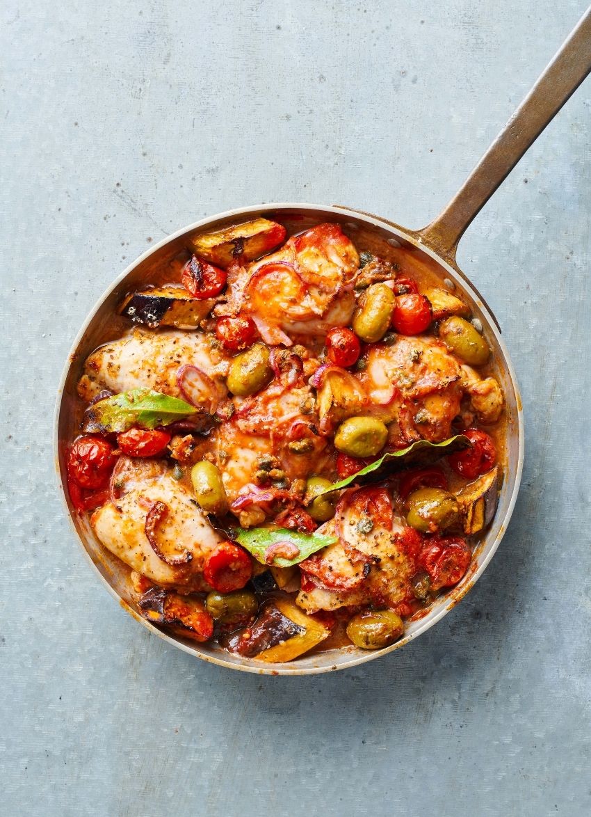 Our favourite Mediterranean flavours of briny olives and capers, garlic, salty anchovies, and tomatoes mingle beautifully in this punchy late-summer meal.