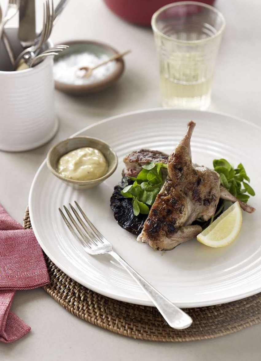 To serve: Place the mushrooms on serving plates. Cut the quail in half and arrange 2 halves and a bunch of watercress on top. Serve with rosemary aioli, crusty bread and a salad.