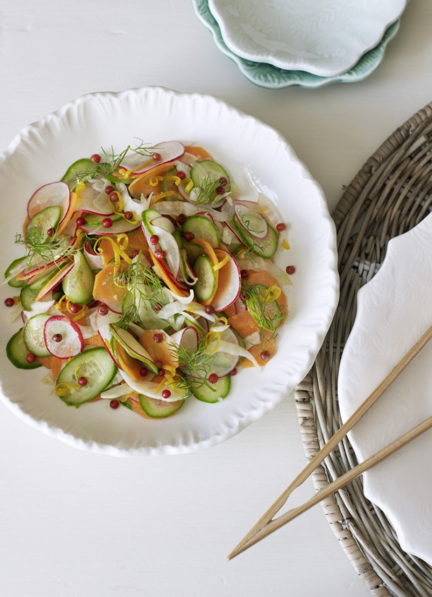 Vegetables: Using a mandolin or a very sharp knife, slice all the vegetables very thinly and toss with the pickling mixture. Transfer to a serving jar or bowl and top with the reserved fennel tops. Best served the day of making. Makes about 2 cups