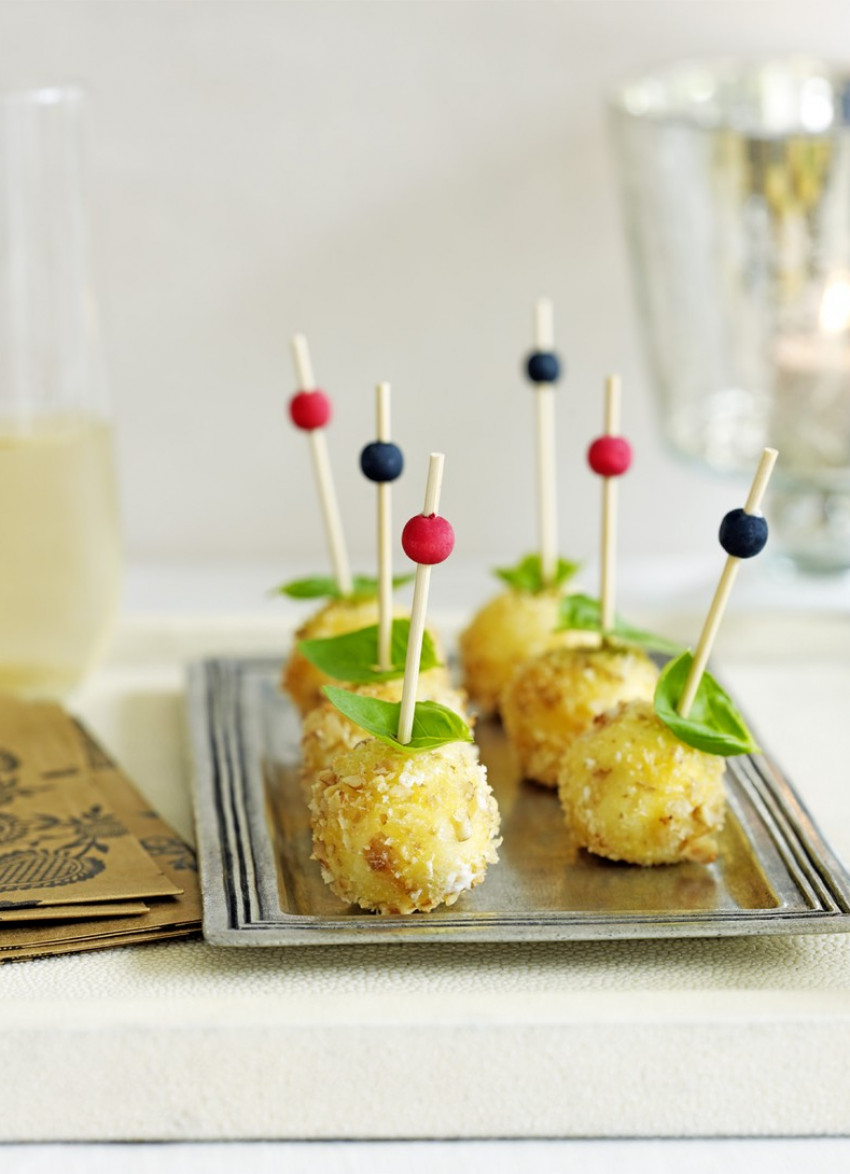 Serve the balls warm on a toothpick garnished with a basil leaf. Makes 12 – 15