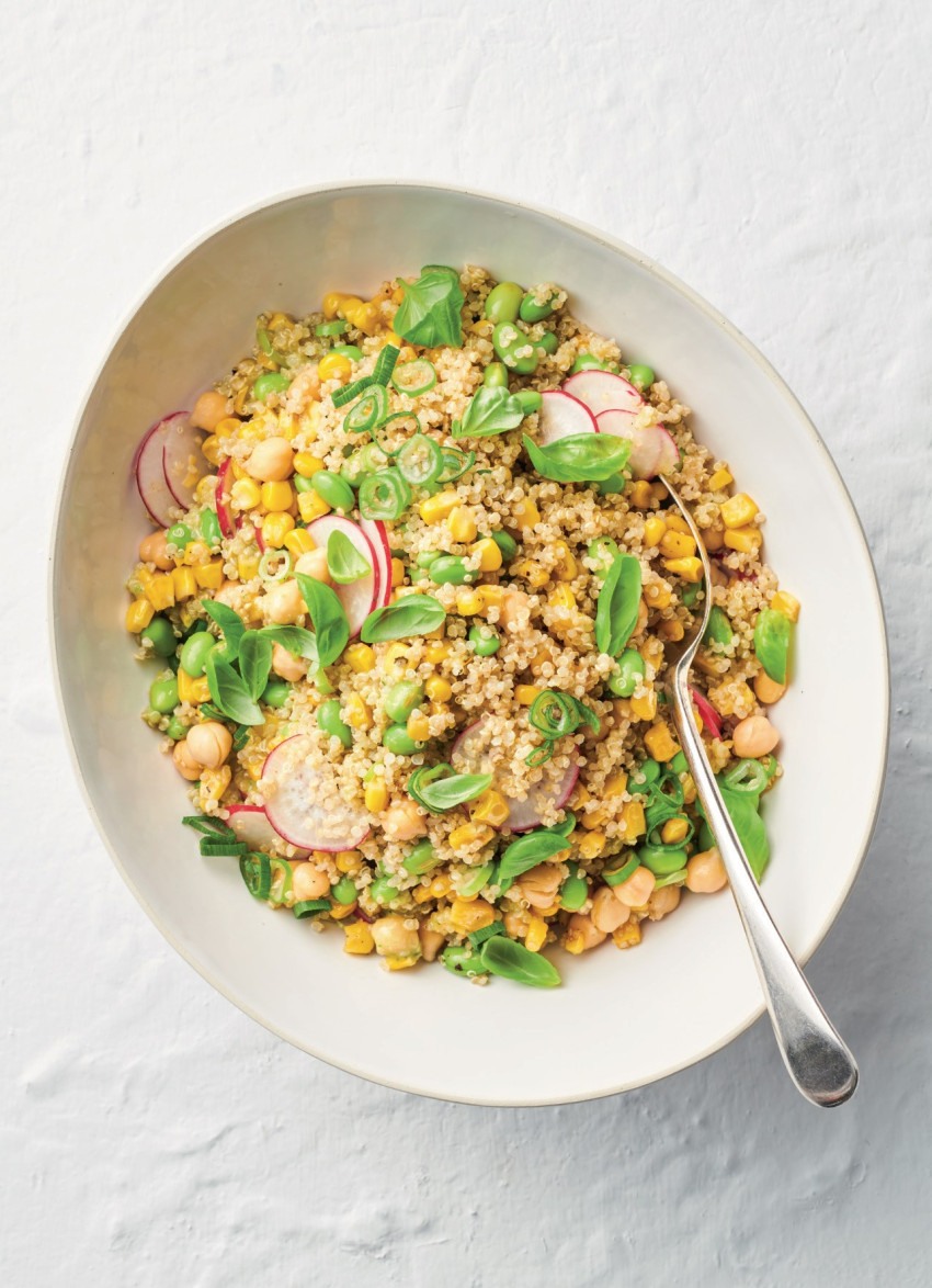 Quinoa, Sweetcorn and Edamame Bean Salad with Honey, Lime and Basil Dressing