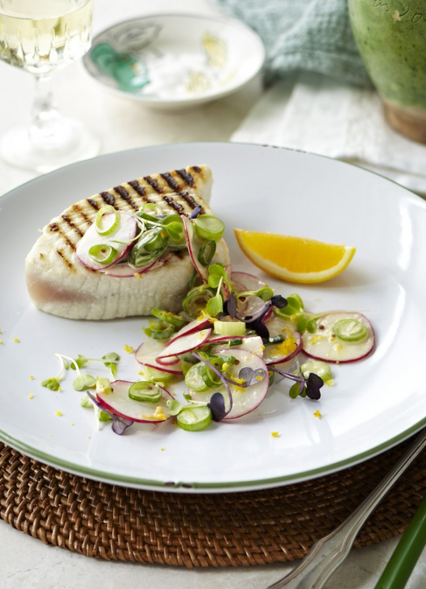 Tuna: Heat a ridged grill or barbecue. Brush both sides of the tuna with olive oil and season with salt and pepper.