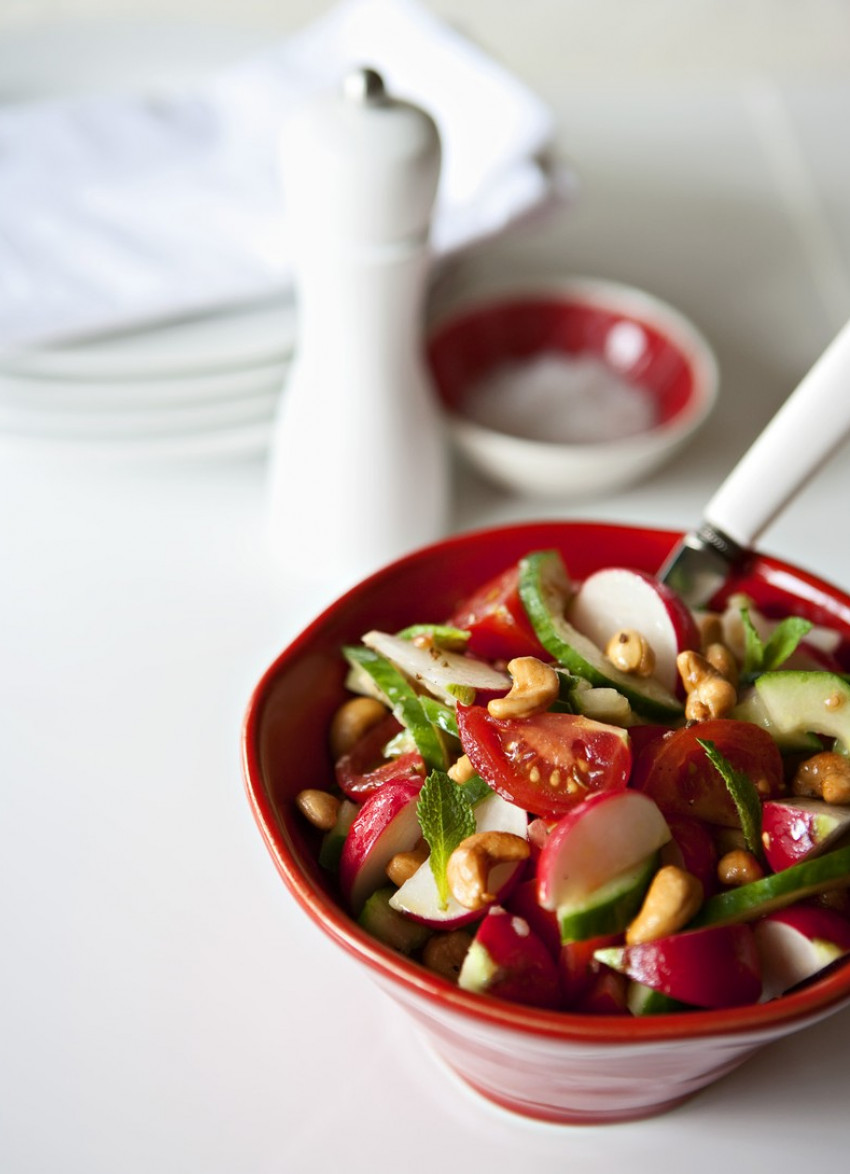 Salad: Halve the cucumber lengthways and scrape out the seeds with a teaspoon. Slice on the diagonal and combine with the other salad ingredients, tossing gently in the dressing.