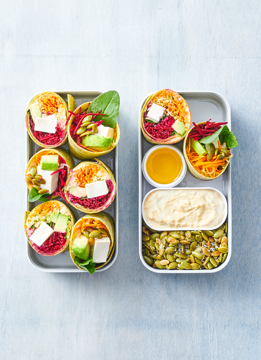 Top with rocket, mint, some of the pumpkin seeds, tofu, beetroot, carrot and avocado. Roll up then slice to serve.