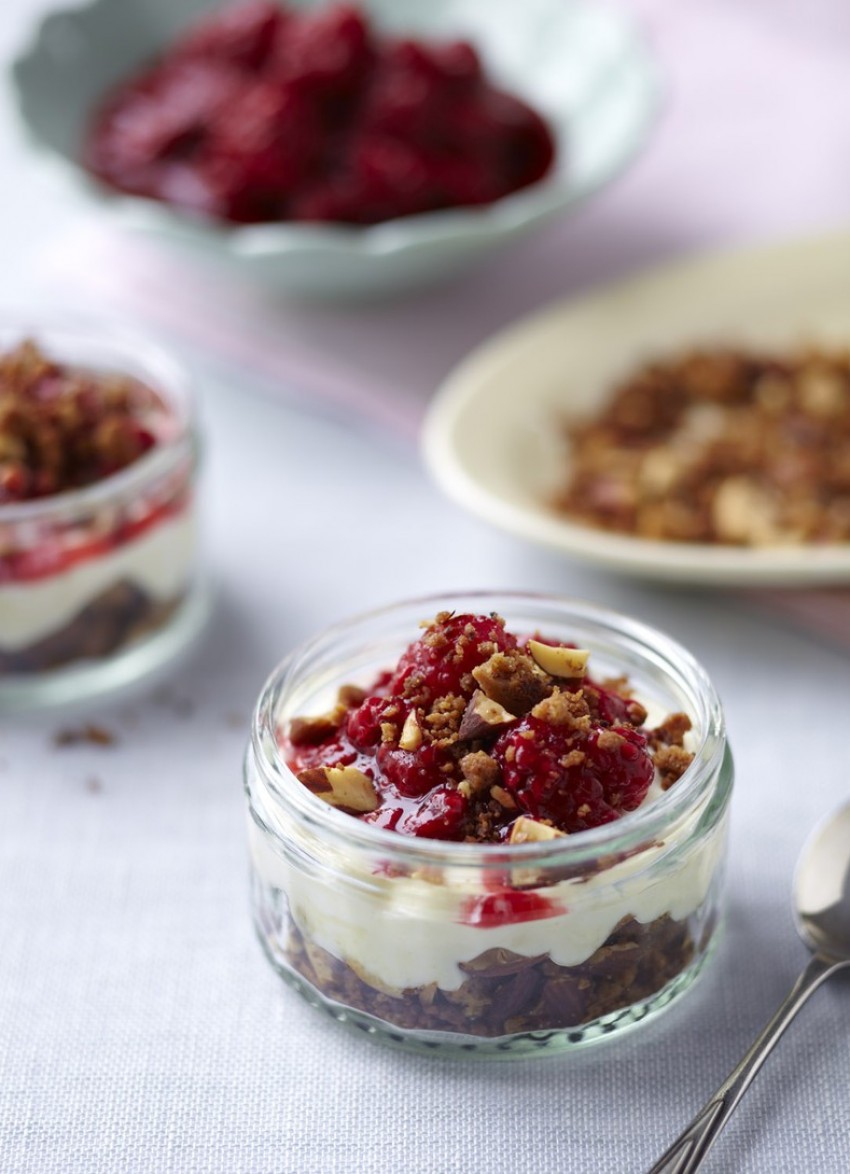 Spoon a layer of the biscuits into the base of 4 glasses or bowls, reserving some for garnish. Top with the yoghurt then the raspberries and the remaining biscuits.
