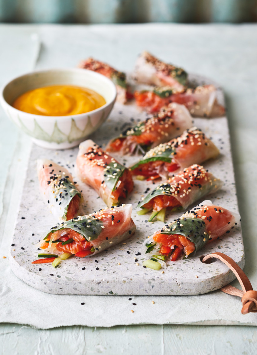 Lightly marinated strips of salmon get rolled up with crisp veges and tender vermicelli noodles. Rather than the traditional dipping sauce, I’ve made a tasty carrot and miso dip.