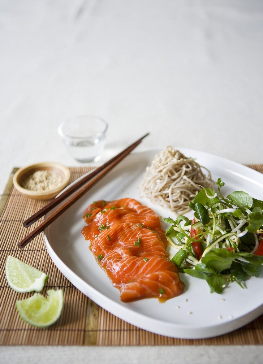 Twist the noodles and place a stack alongside the salmon. Sprinkle with sesame seeds.