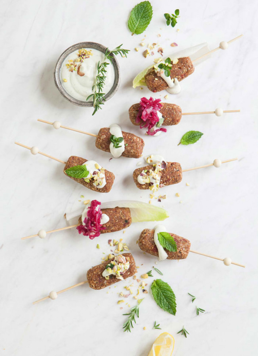 Serve each kofta inside a whitloaf leaf, with the raw minted cashew yoghurt (see recipe below) and a little of the cabbage/beet ferment, crushed pistachios and fresh herbs. Makes 12.
