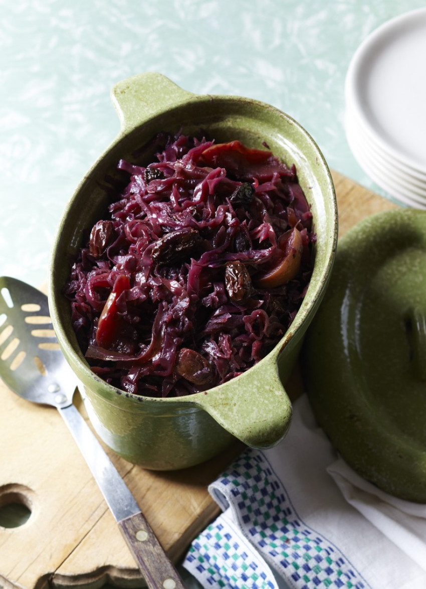 To preserve the dramatic colour of this richly flavoured braised red cabbage, an acidic ingredient in the form of vinegar, wine or citrus juice is needed, otherwise it turns an undesirable shade of blue.