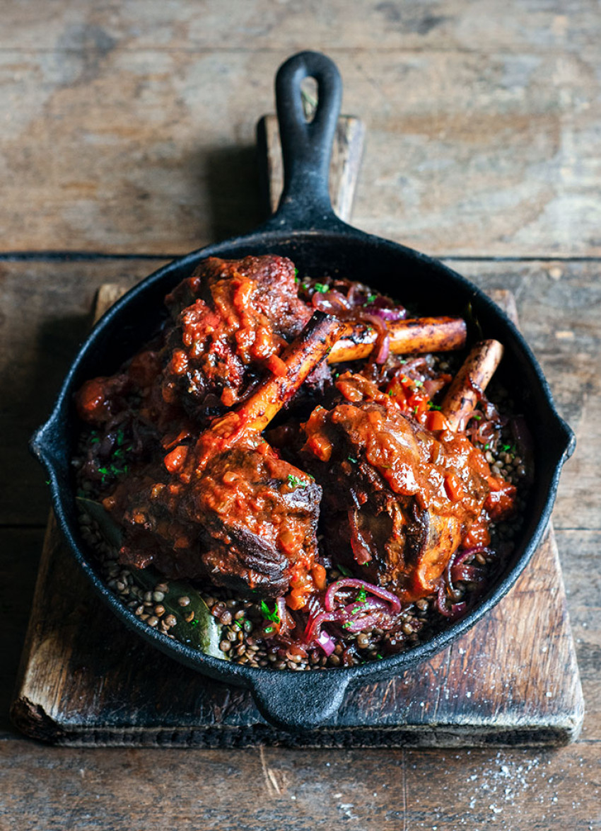 For luscious, meltingly tender shanks, cook these the day before then reheat before serving with the lentils and some steamed beans, if desired.