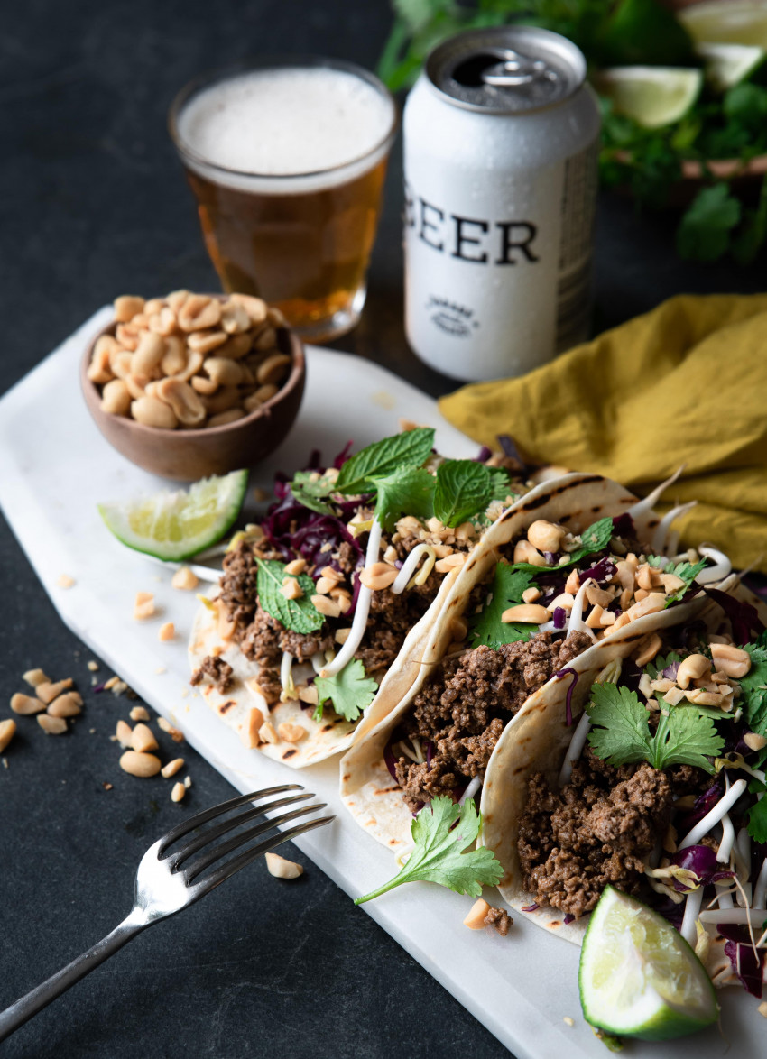 Assemble the wraps starting with the pickled cabbage and sprouts. Then add the mince with chopped peanuts on top.