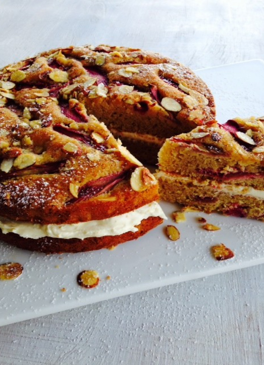 Tart rhubarb pairs beautifully with almonds and a touch of spice in this easy, moist cake. Sandwiched with a creamy lemon filling it’s perfect anytime of the day.