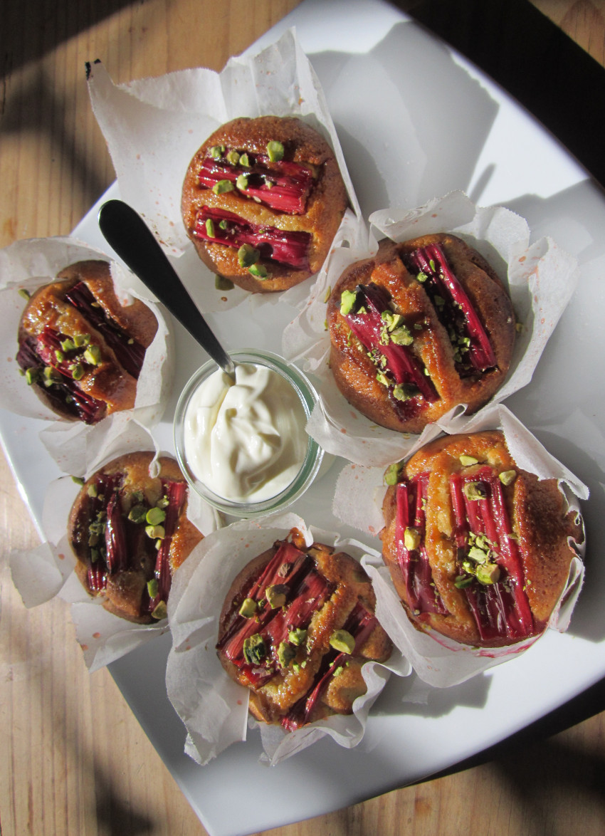 Place 2–3 pieces of rhubarb on top of each cake and bake for 20 – 25 minutes until the tops are golden and the cakes are puffed and risen.