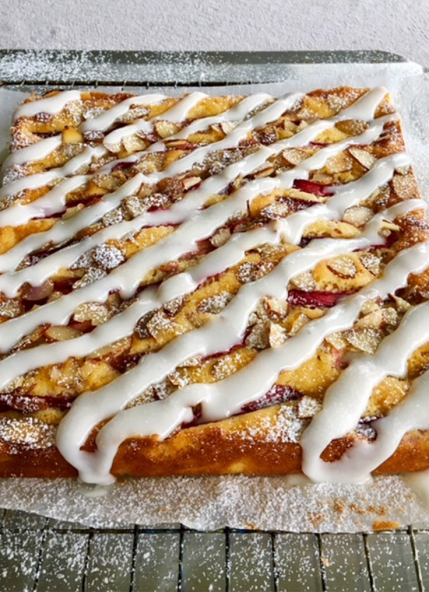 Spoon into the tin and scatter over the remaining rhubarb then the almonds.