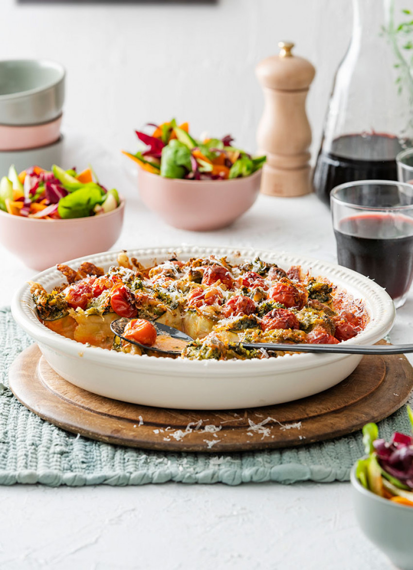 To assemble: Drain the juice from the tomatoes into a jug, add the cream and season. Pour half into the base of the baking dish.