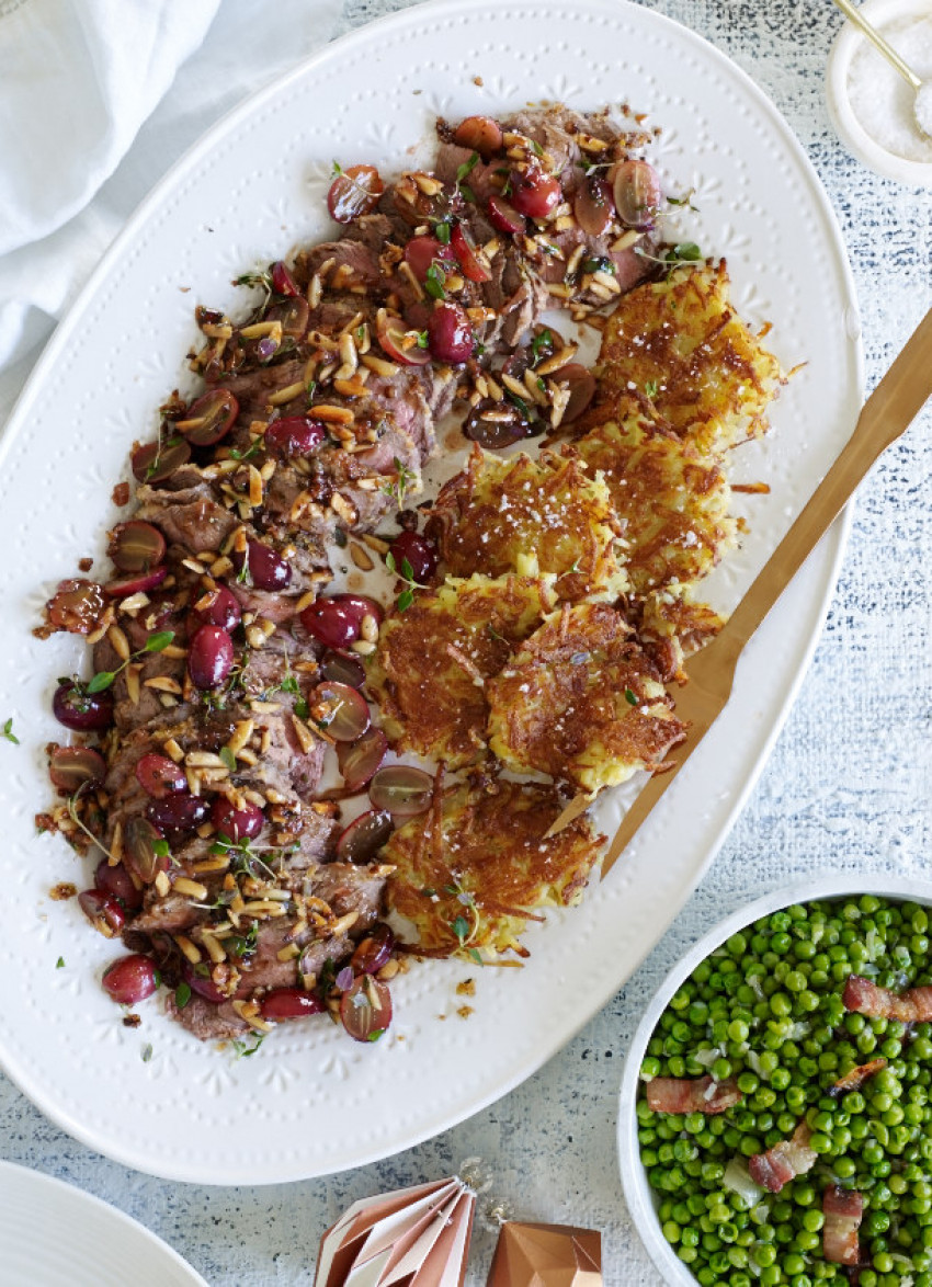 To serve: Transfer the lamb to a chopping board, sprinkling salt on all sides as best you can. Rest for 7 minutes. Slice lamb thinly, arrange on a warm serving platter and spoon over the warm grape and almond jus. Serve immediately with potato rosti and peas with pancetta.