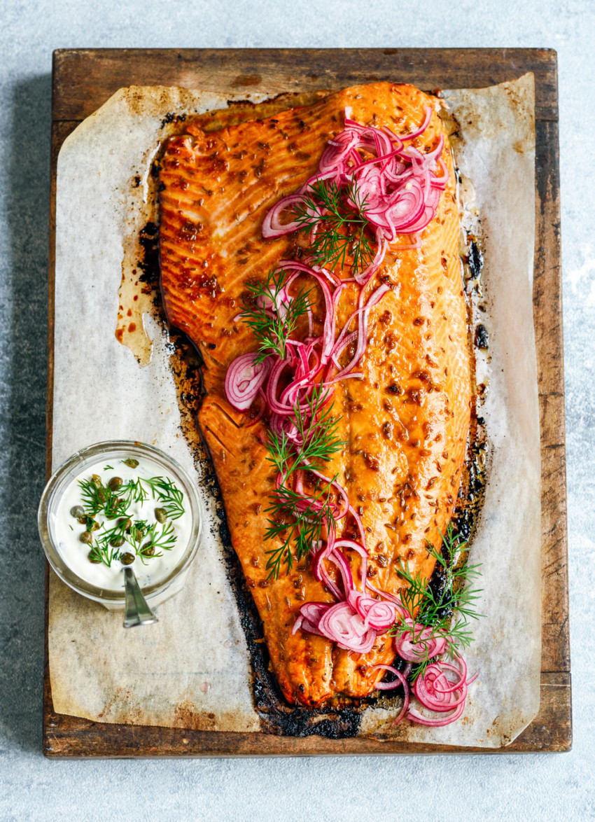 Once cooked, the salmon can be served immediately or refrigerated until half an hour before serving. When ready to serve, garnish with the dill and drained onion and serve with the herby yoghurt mayo, garnished with capers and dill fronds.