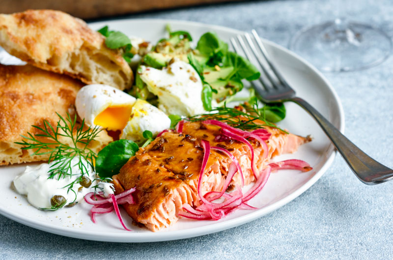 Even non-salmon lovers can’t resist this dish. Not too oily, glazed in tangy pomegranate molasses, just-cooked and with a side of sharp quick-pickled red onion and a dollop of herby yoghurt mayo, it is a total winner.