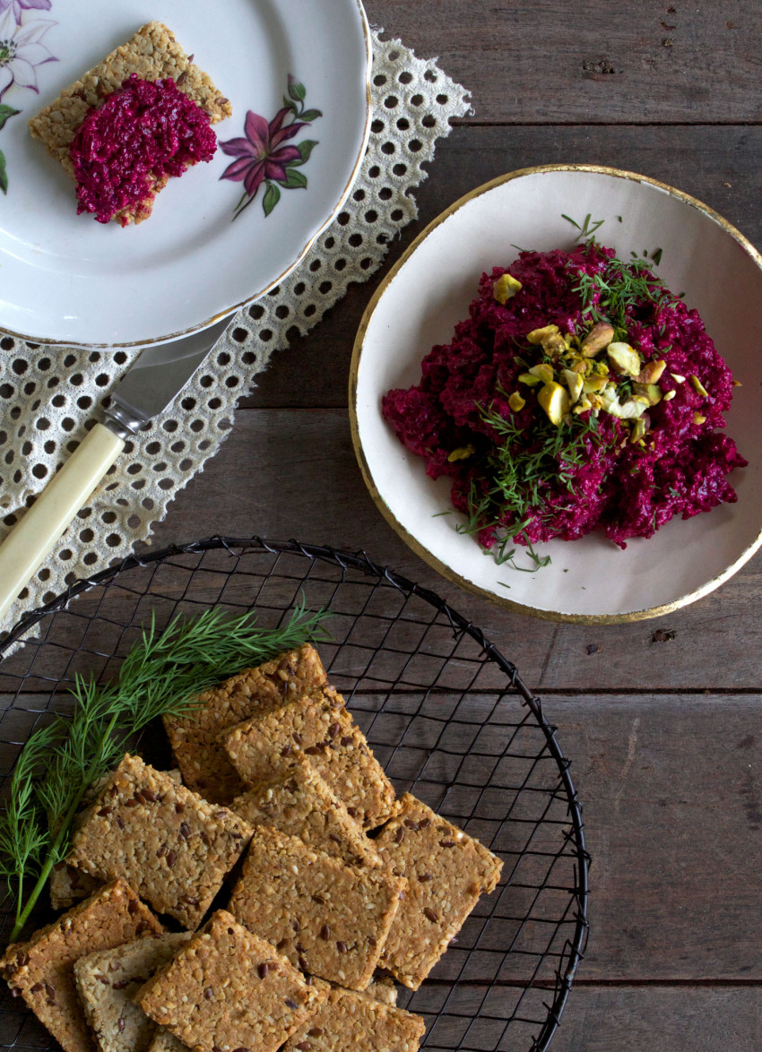 Roasted beetroot combined with the richness of walnuts and a little kick of horseradish is the perfect partner to my tasty seed crackers. I love that this is rich and lush while still feeling light thanks to the absence of beans or legumes. Perfect for entertaining!