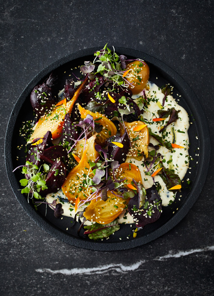 To serve: Spread the dressing over the base of a large serving plate. Top with the beetroot, then scatter over the garnishes. Serves 8