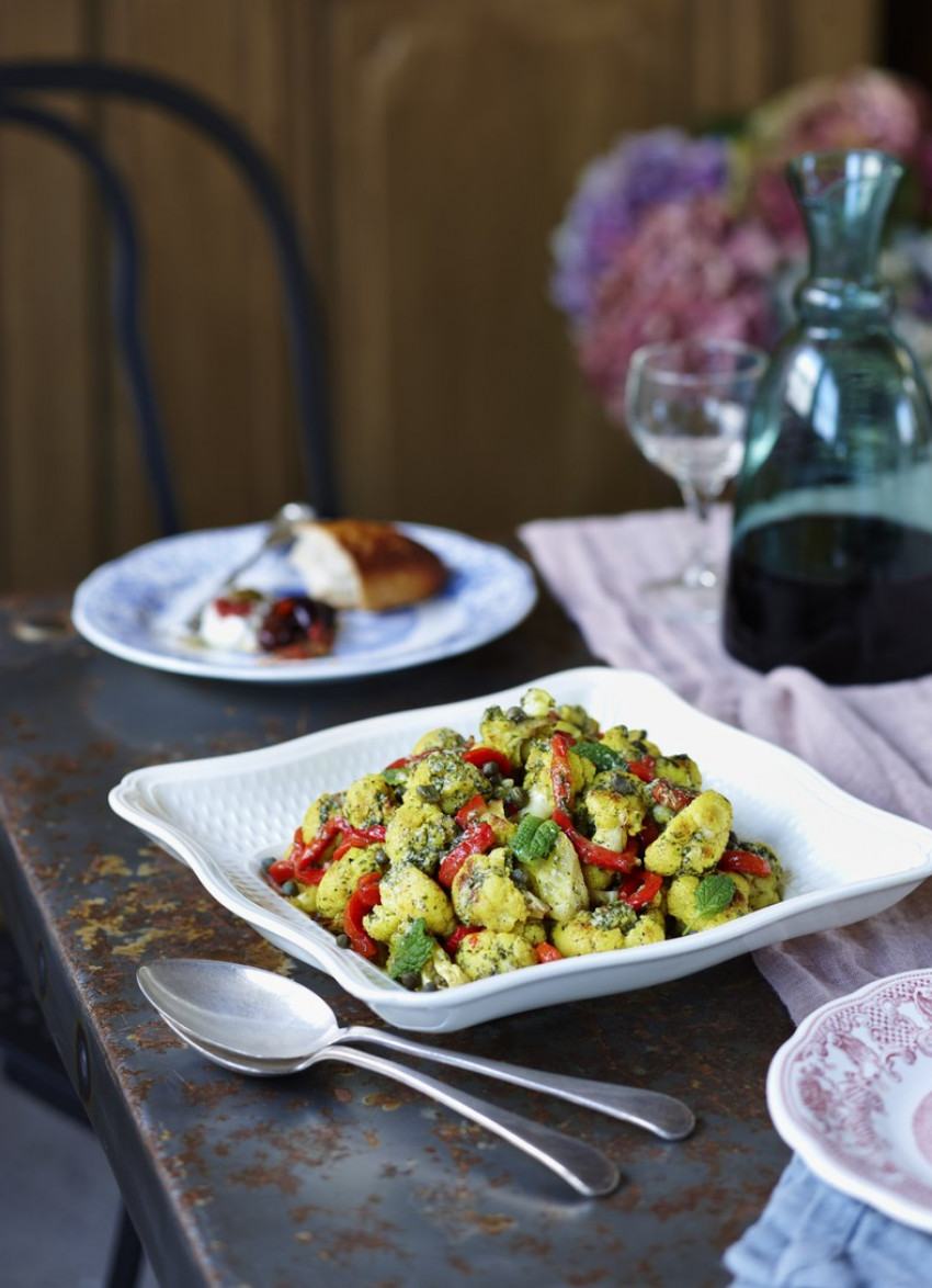 To serve: Toss the cauliflower and capsicum with the dressing and place in a shallow bowl. Scatter with the capers and garnish with extra mint.