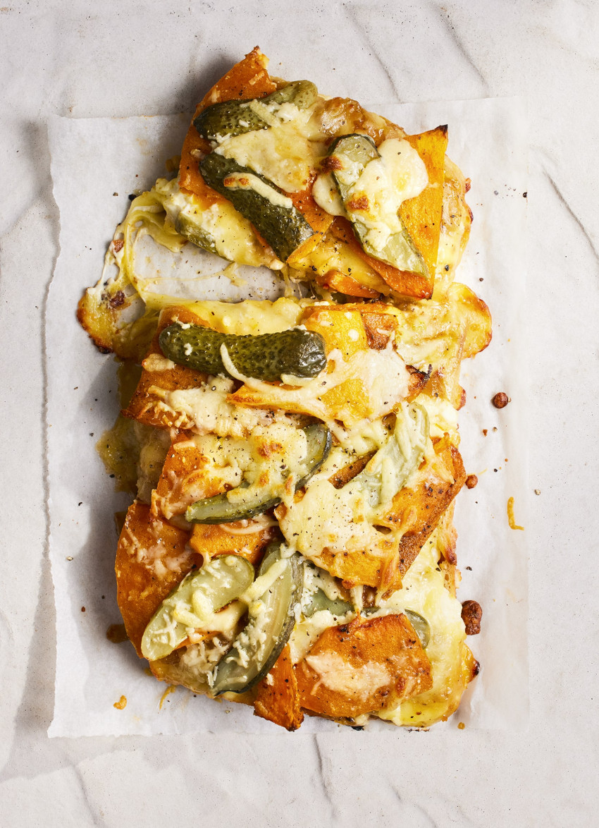 Halve the bread lengthways and place the bottom half on a lined baking tray. Save the other half for making breadcrumbs and freeze. Spread with the cream cheese, then the chutney. Combine the cheeses and layer up with the pumpkin and gherkins. Season with salt and pepper.