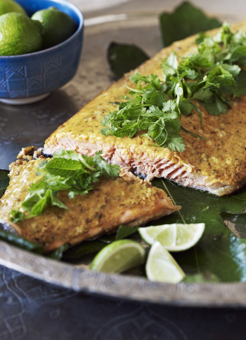 To serve: Slide the salmon onto a serving platter. Scatter with coriander and mint leaves and garnish with lime wedges.