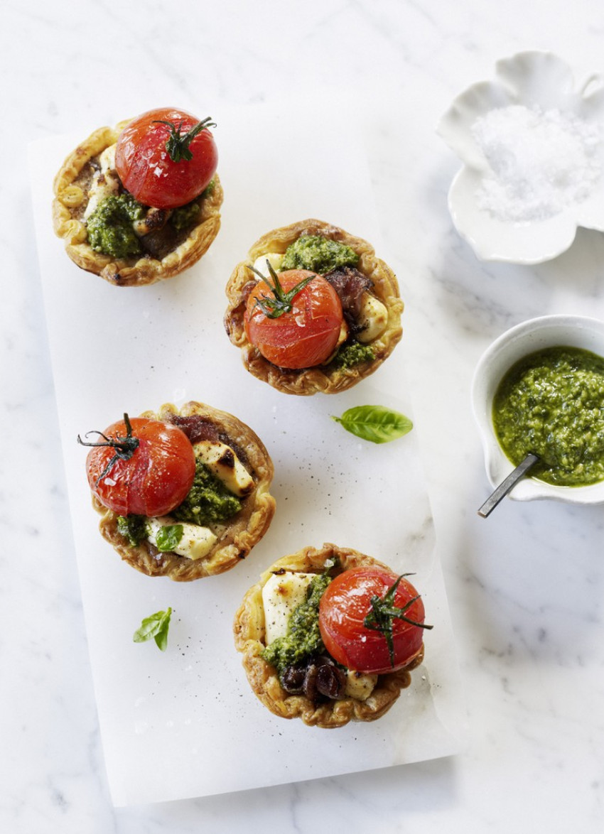 To serve: Top each tart with a spoonful of pesto and a roasted tomato. The tarts are best served warm or at room temperature. Makes 12