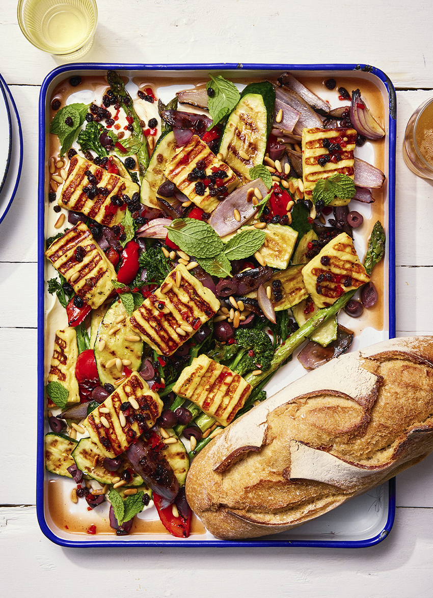 In batches, cook the vegetables and haloumi on the hotplate, brushing generously with oil and seasoning with salt and pepper as you go.