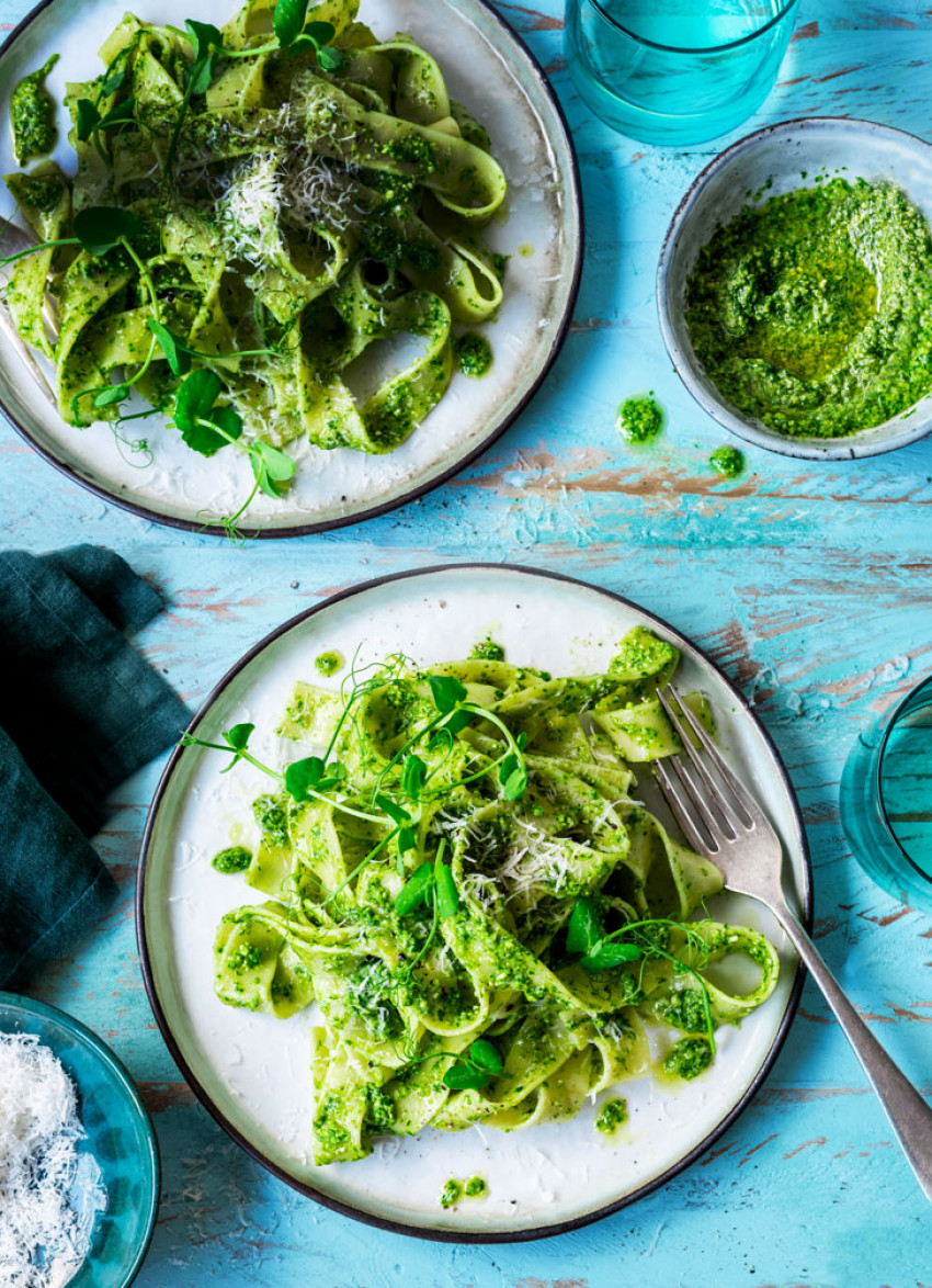 To serve: Stir pesto and cooking water through pasta and serve with finely grated parmesan and pea shoots.