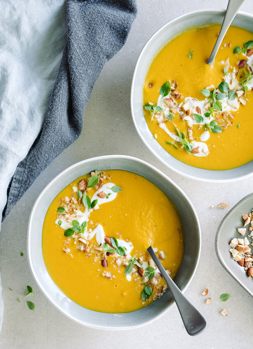 Add the garlic, ginger and curry paste and cook for 1 minute.Stir in the carrots and sweet potato, season with salt and pepper.Add the stock or water and bring to the boil. Cover and simmer for 20 minutes, then stir in the almond butter. Use an immersion blender or food processor to blend until smooth.