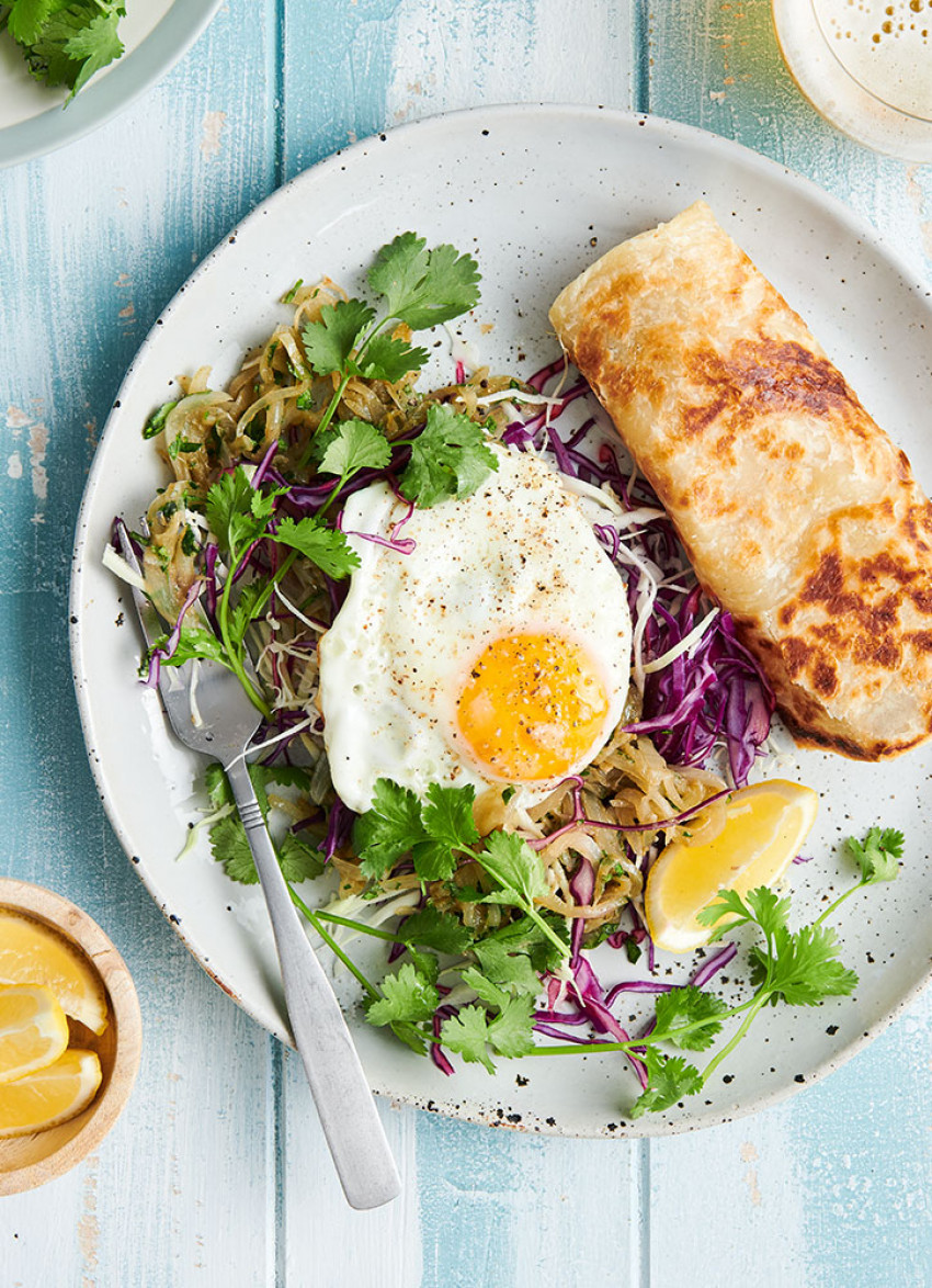 To serve: Layer cabbage, onions, fried egg and coriander on each plate, season and serve with a roti and a lemon wedge.