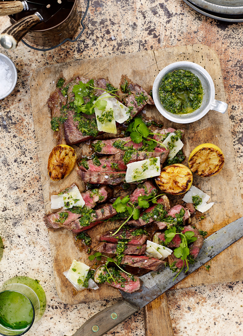 Rest the steak for a few minutes before carving. Top with spoonfuls of dressing and shaved parmesan and serve with the lemons for squeezing over the top. Pass extra dressing separately.