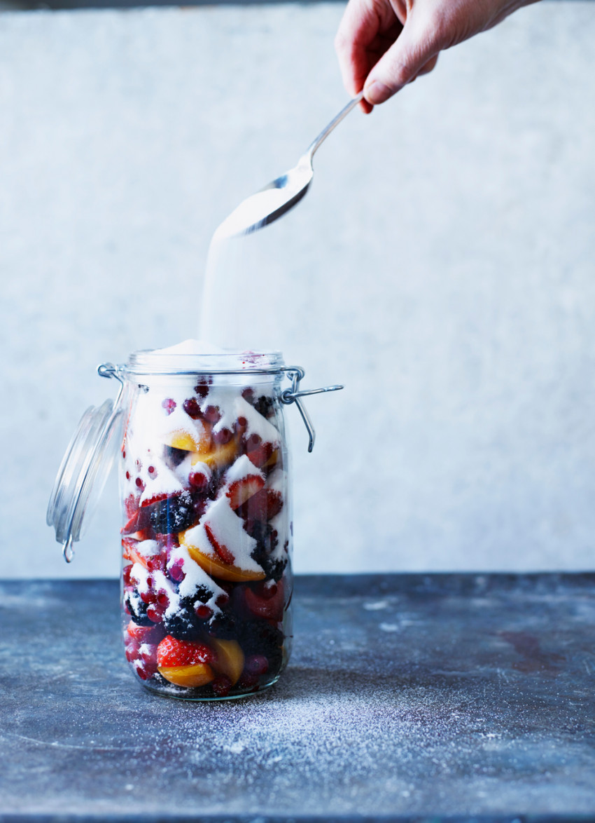 Layer the fruit inside the jar, taking care not to bruise it. Pour over the sugar and rum, making sure that all of the fruit is fully submerged. Fasten the lid and shake the jar very gently to distribute the sugar.
