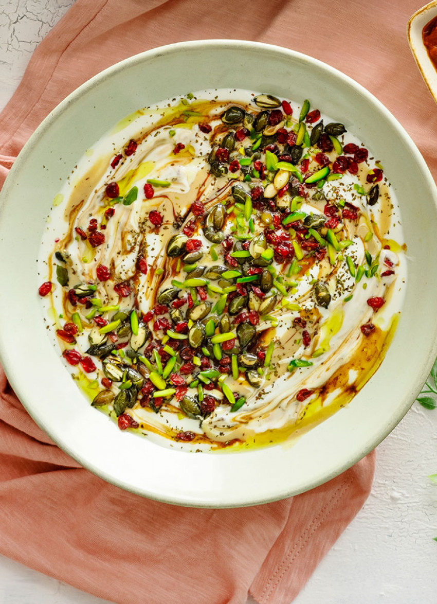A simple bowl of yoghurt is easily transformed into something special by adding a few delicious toppings. Use whatever seeds and nuts you have, and fresh herbs can be used in place of the dried mint.