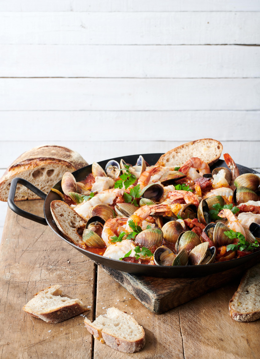 It’s easy to tailor this recipe to use whatever fresh seafood is on hand. You can use all fish and you can also substitute mussels for the clams if desired. Serve with warm, crusty sourdough bread for mopping up all the juices.