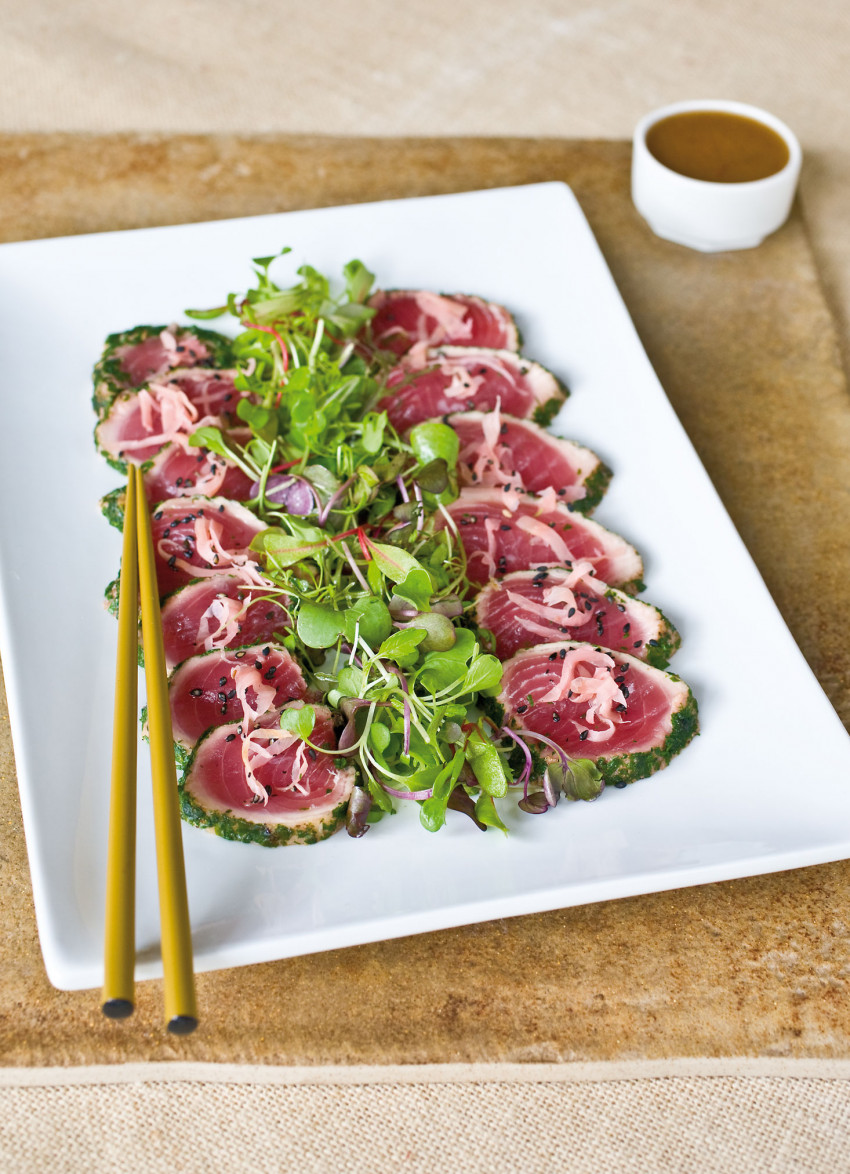 Tuna: Brush the tuna with olive oil and season with salt and freshly ground pepper. Spread the herbs on a chopping board and roll the tuna in the herbs to coat on all sides, pressing it on firmly to adhere.