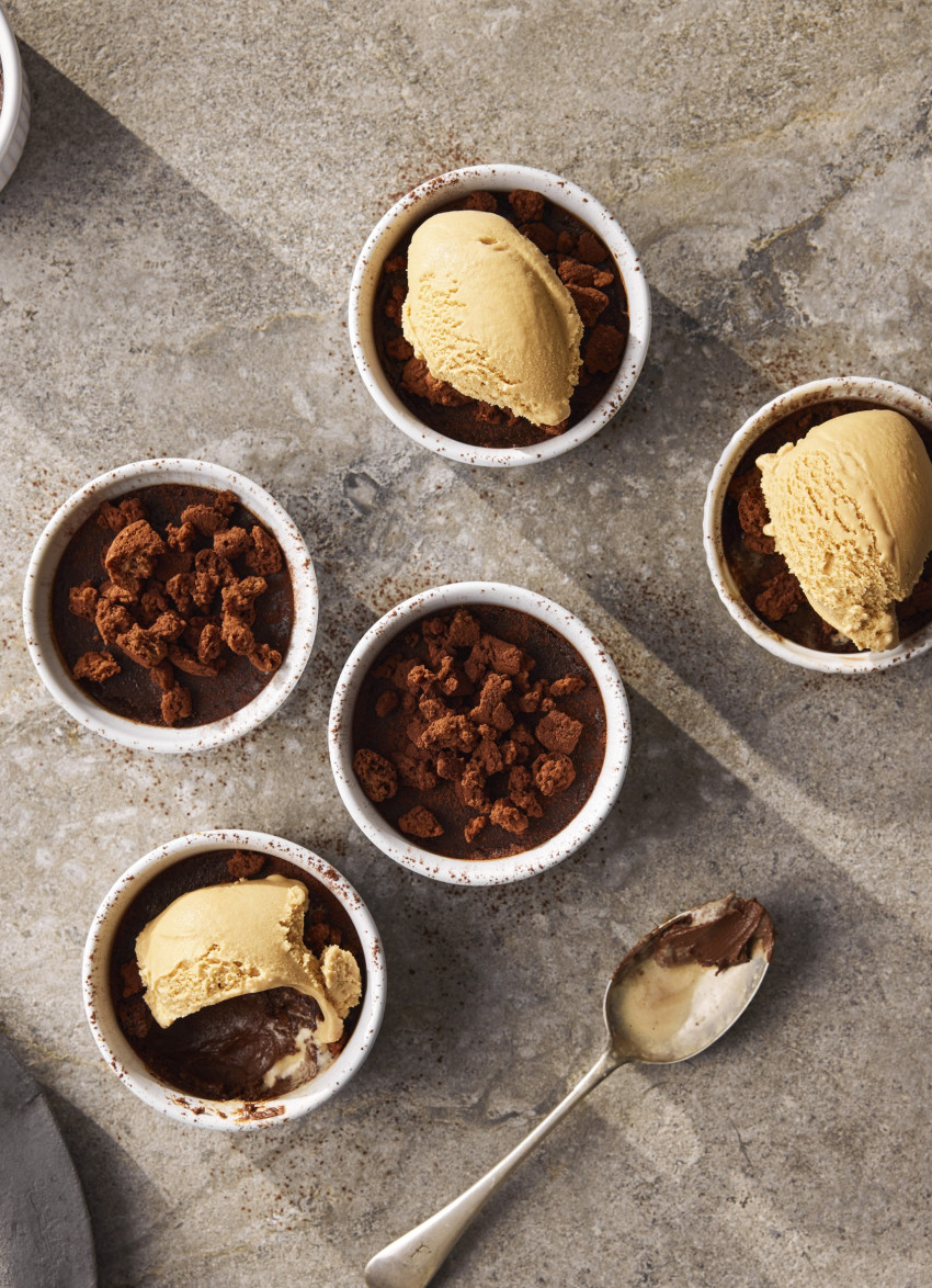 Silky Chocolate and Hazelnut Budino with Amaretti Crumb and Salted Caramel Gelato