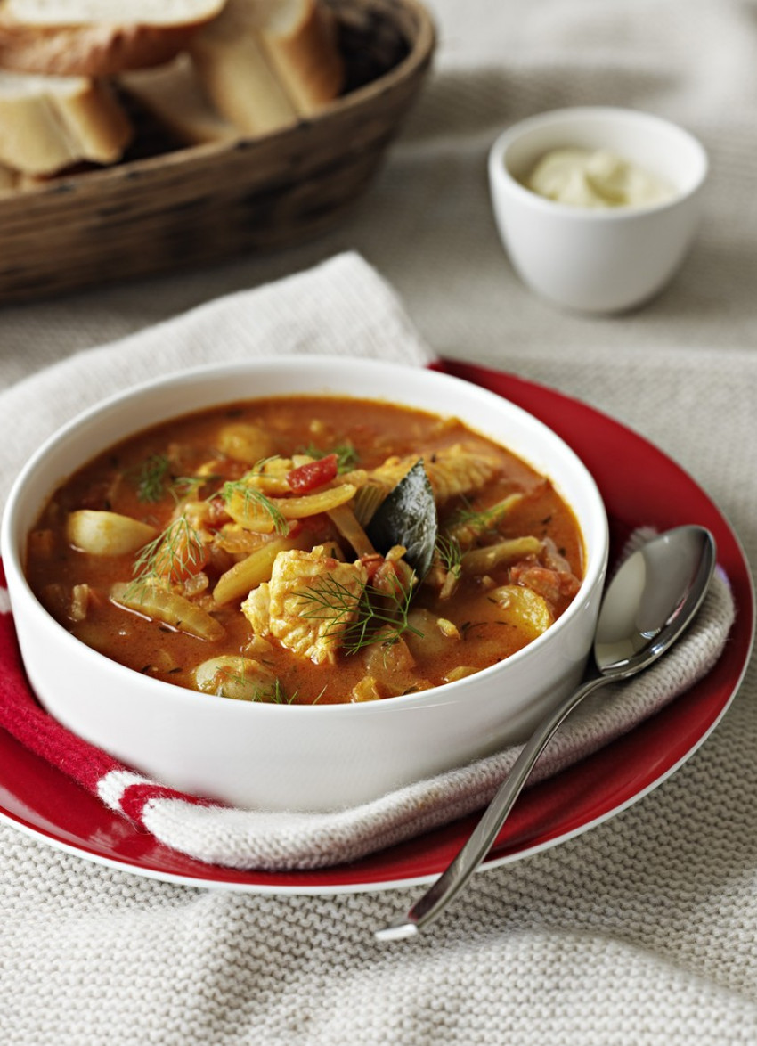 To serve: Ladle the soup into warm, shallow soup bowls and top with a few of the reserved fennel fronds. Serve with warm crusty bread and a dollop of garlic aioli.