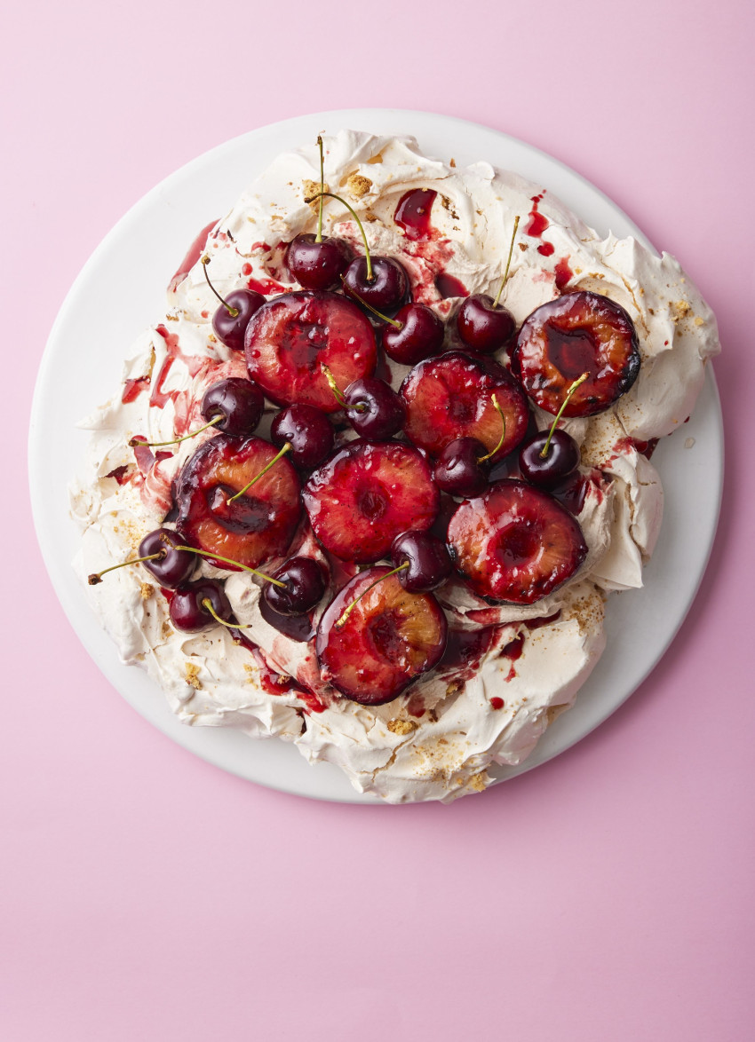 Slab of Pav with Spice Grilled Plums and Chocolate Cream