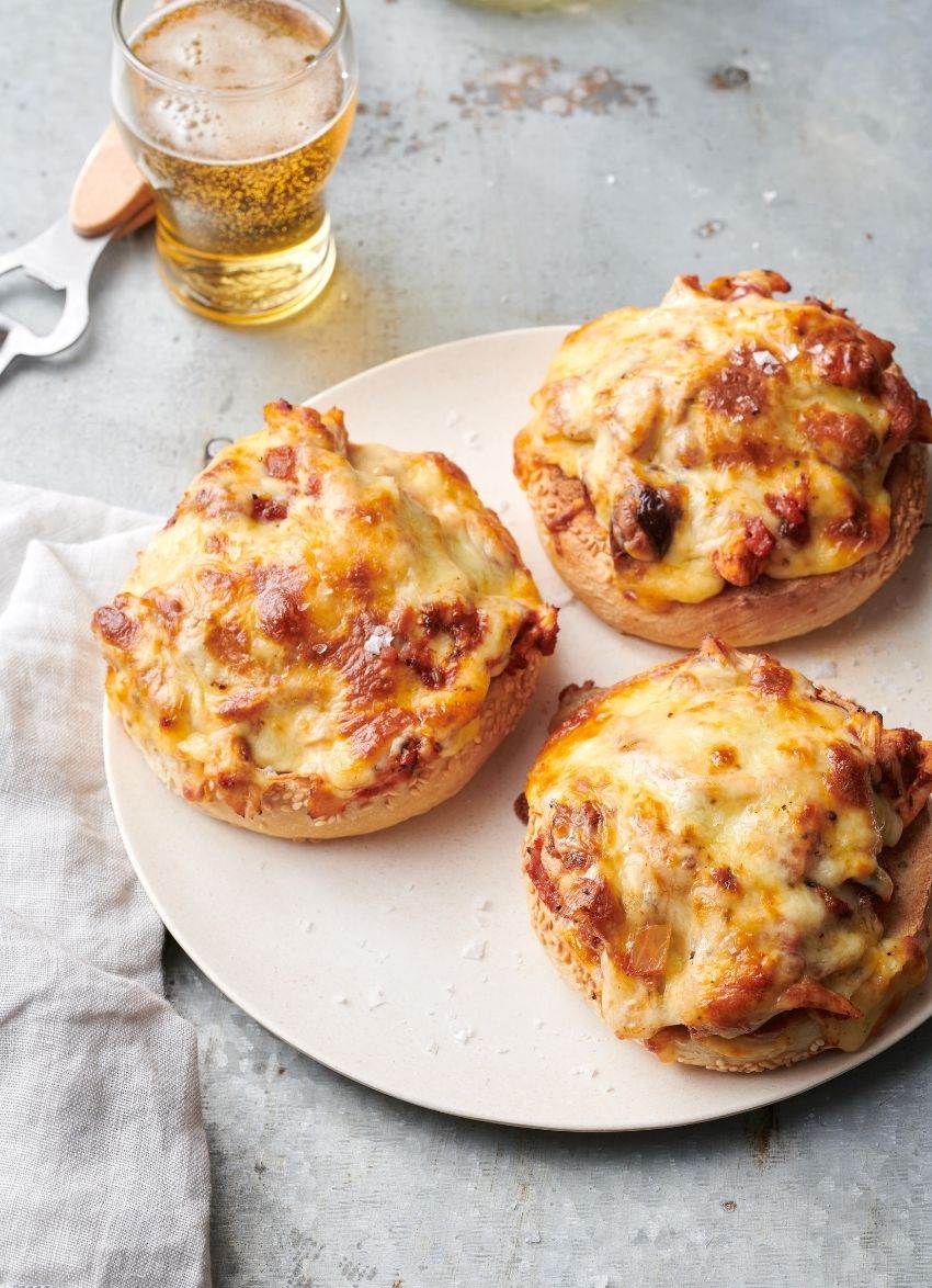 Lunch or dinner doesn’t come much easier than this! Make sure you use a very thick sauce otherwise the bagels will be soggy.