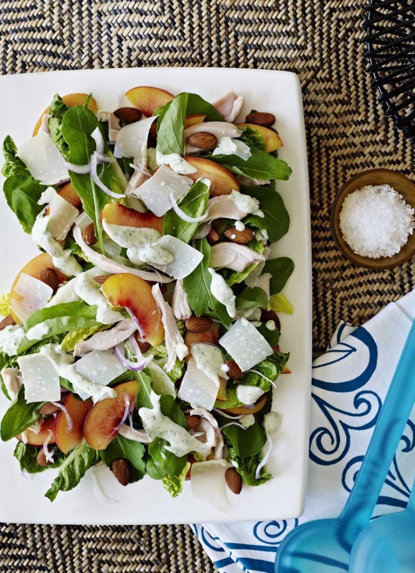 To assemble: Layer half the salad ingredients on a platter, shave over some Parmesan and drizzle with some of the dressing. Repeat with the remaining ingredients and drizzle with more dressing. Serve the remaining dressing separately in a small bowl.