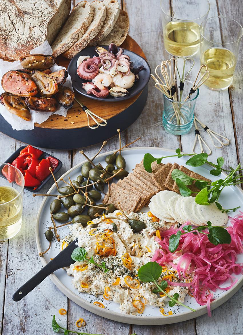I’ve used a moist white fish but hot smoked salmon or trout are also delicious. To feed a crowd, add any of our suggestions and for a more luxurious offering, add oysters in the shell and cooked prawns to the line-up.