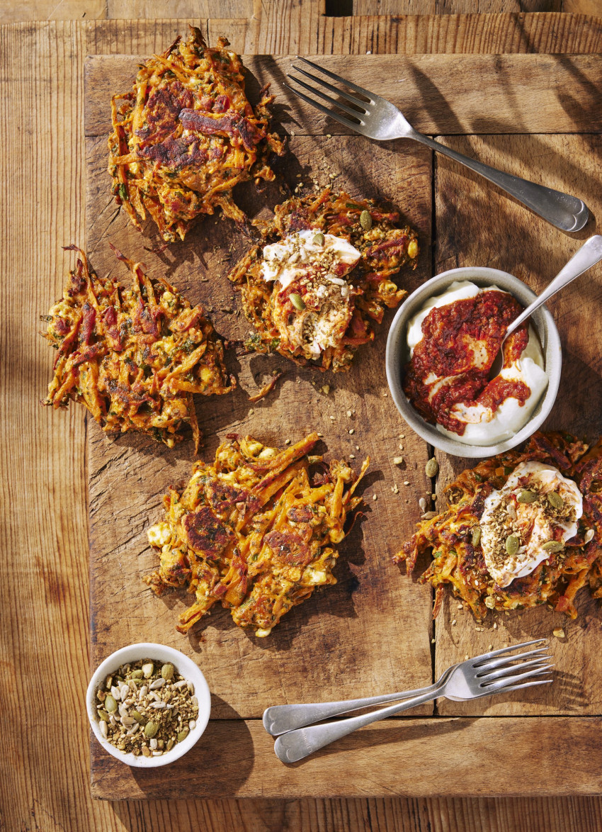 Smoky Carrot, Feta and Kūmara Fritters