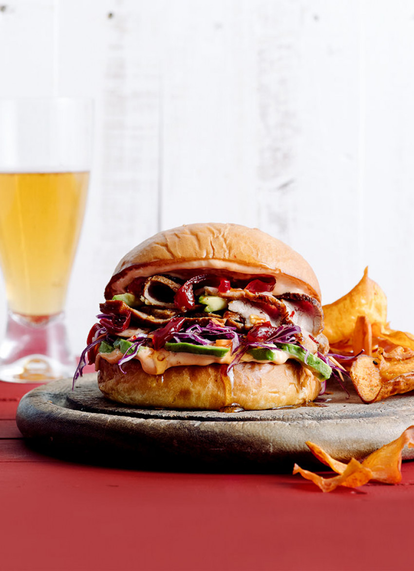 To assemble: Combine the mayonnaise and sriracha and generously spread on the cut sides of the buns. Layer up the bun bases with avocado, slaw, sliced pork and a spoonful of chilli jam. Add the bun tops and serve immediately.
