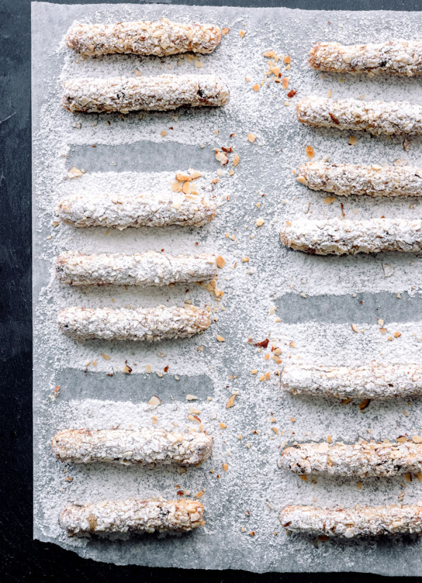To assemble: Spread the almonds out on a large plate. Lightly wet the palms of your hands with cold water and roll tablespoons of dough into balls, gently squeezing to compact the mixture. Place on the bench and roll out under your fingers into 10cm lengths then roll each one to coat in the nuts.