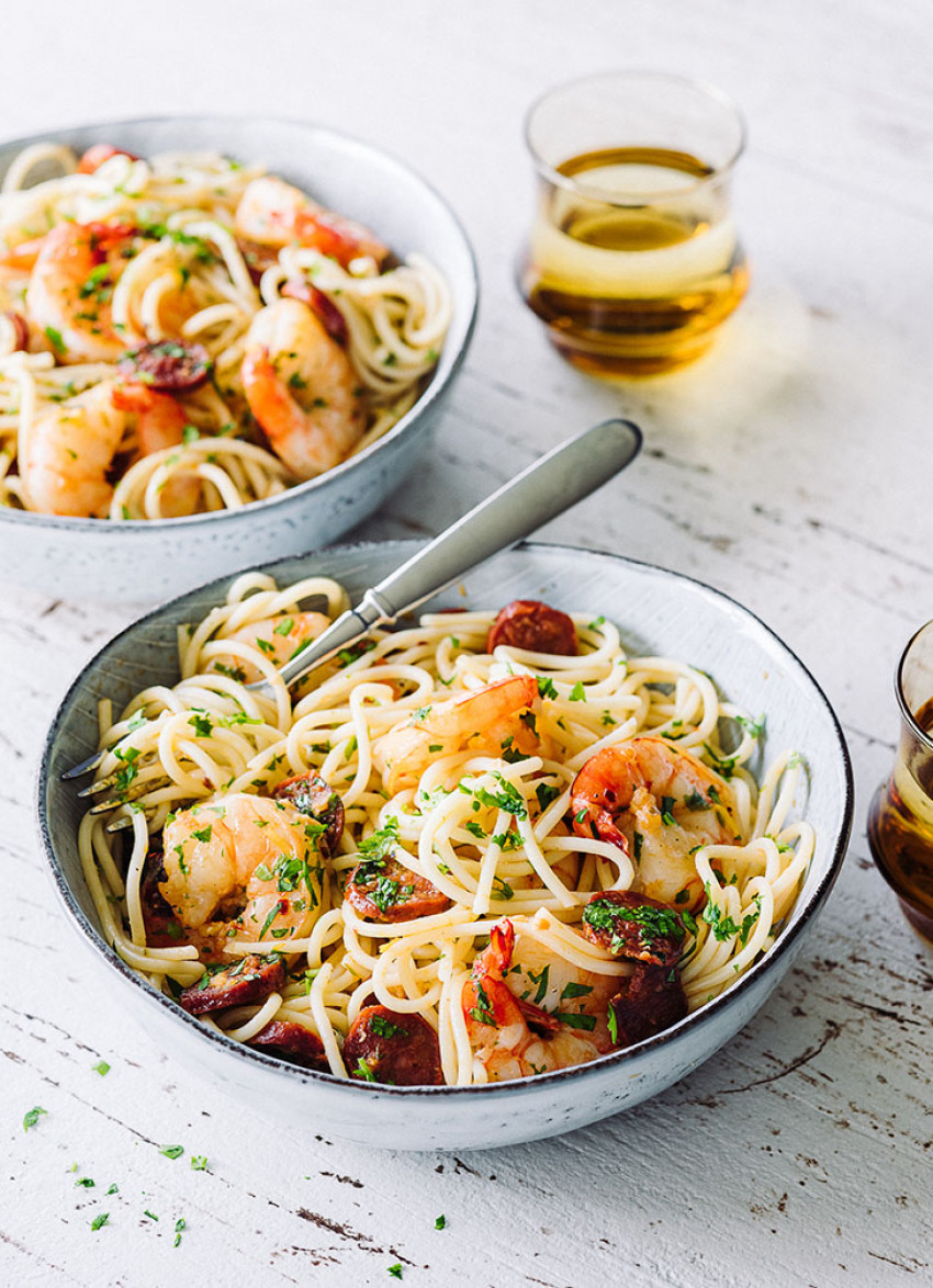 Spaghetti with Prawns, Chorizo, Lemon and Chilli