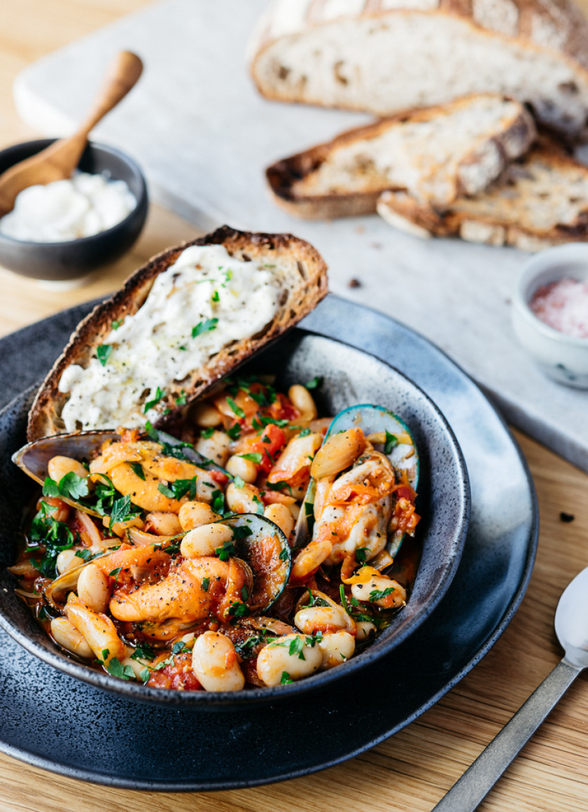 To serve: Add the mussels and parsley to the bean mixture and stir. Serve with the grilled bread, spread with mayonnaise.