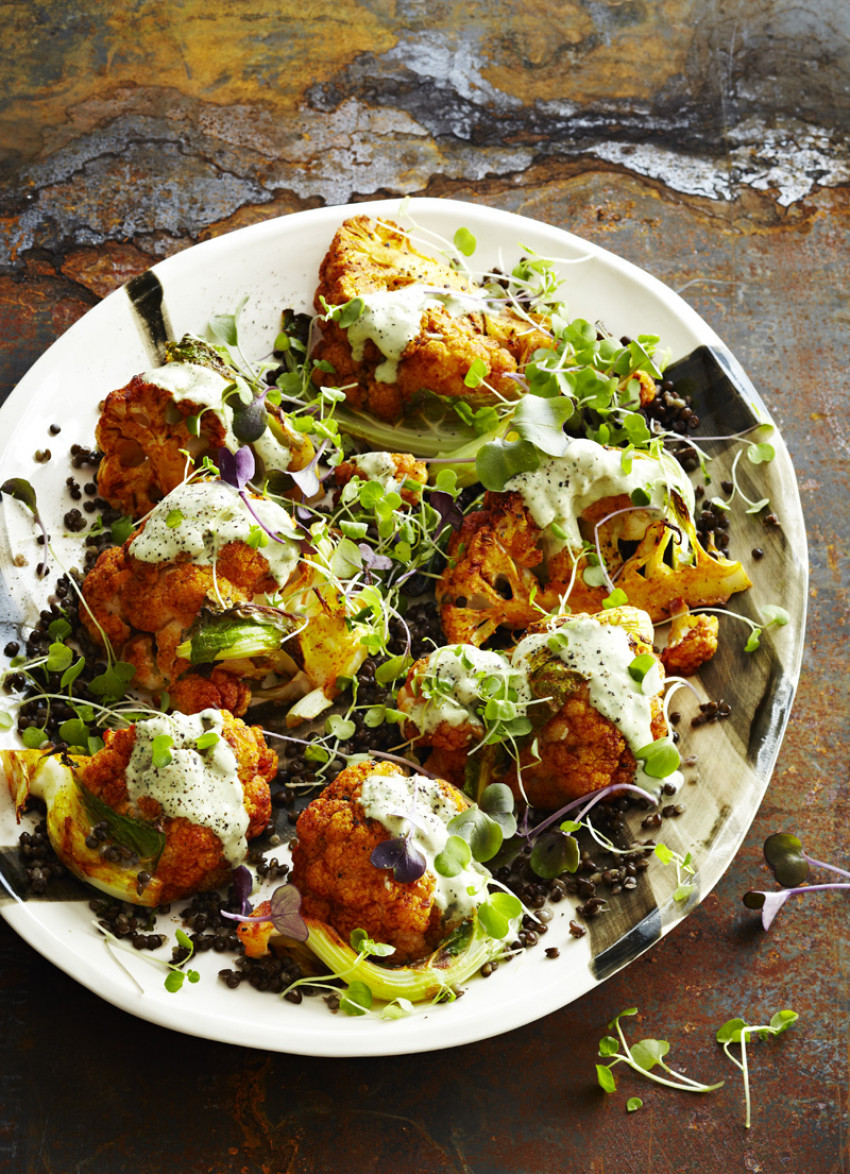 To serve: Spread the lentils on a platter and top with the cauliflower. Drizzle over some of the dressing, serving the rest separately. Garnish with micro greens, if using.