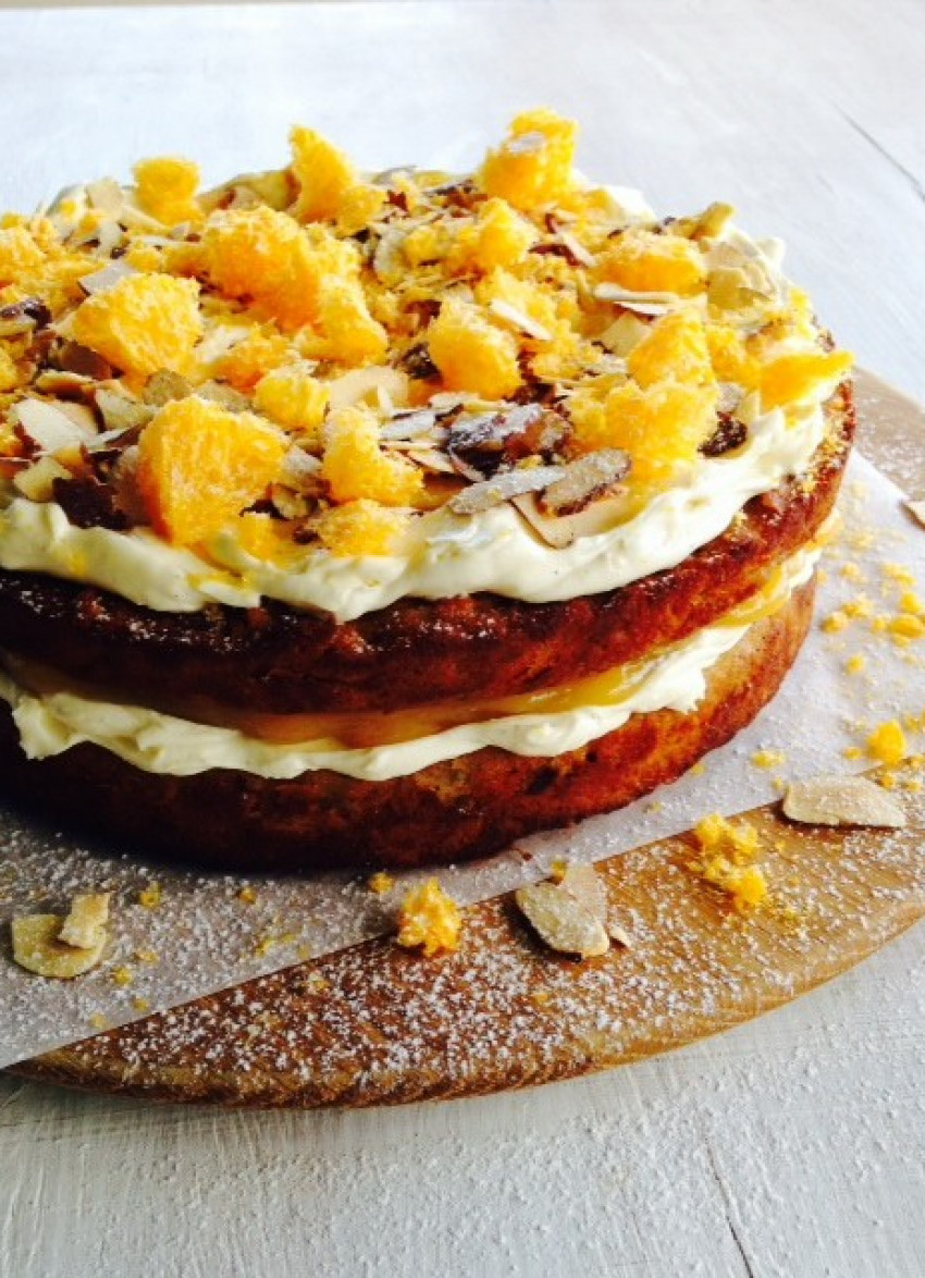 Spread the remaining icing over the top of the cake and decorate with the almonds, orange segments and a dusting of icing sugar. Makes 1 cake.